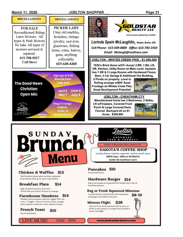 Call us: 615-876-7165 or Email: joeltonshopper@comcast.net