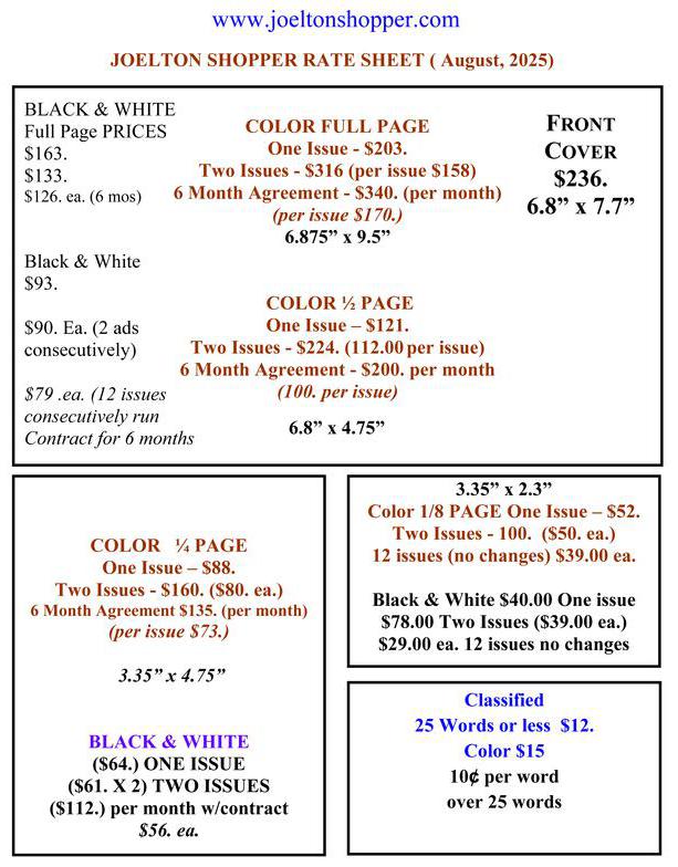 Call us: 615-876-7165 or Email: joeltonshopper@comcast.net